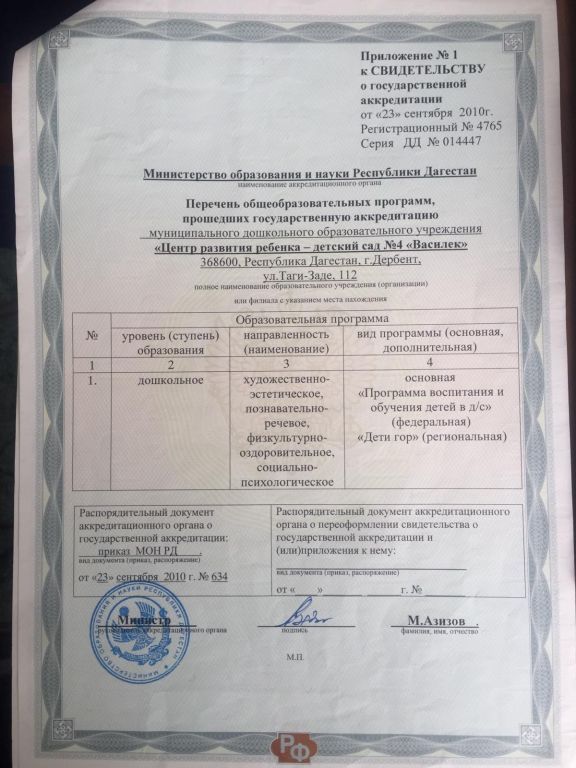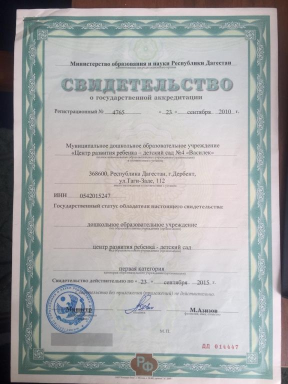 Полное наименование образовательной организации* Муниципальное бюджетное дошкольное образовательное учреждение городского округа "город Дербент" "Центр развития ребенка детский сад № 4 "Василек"